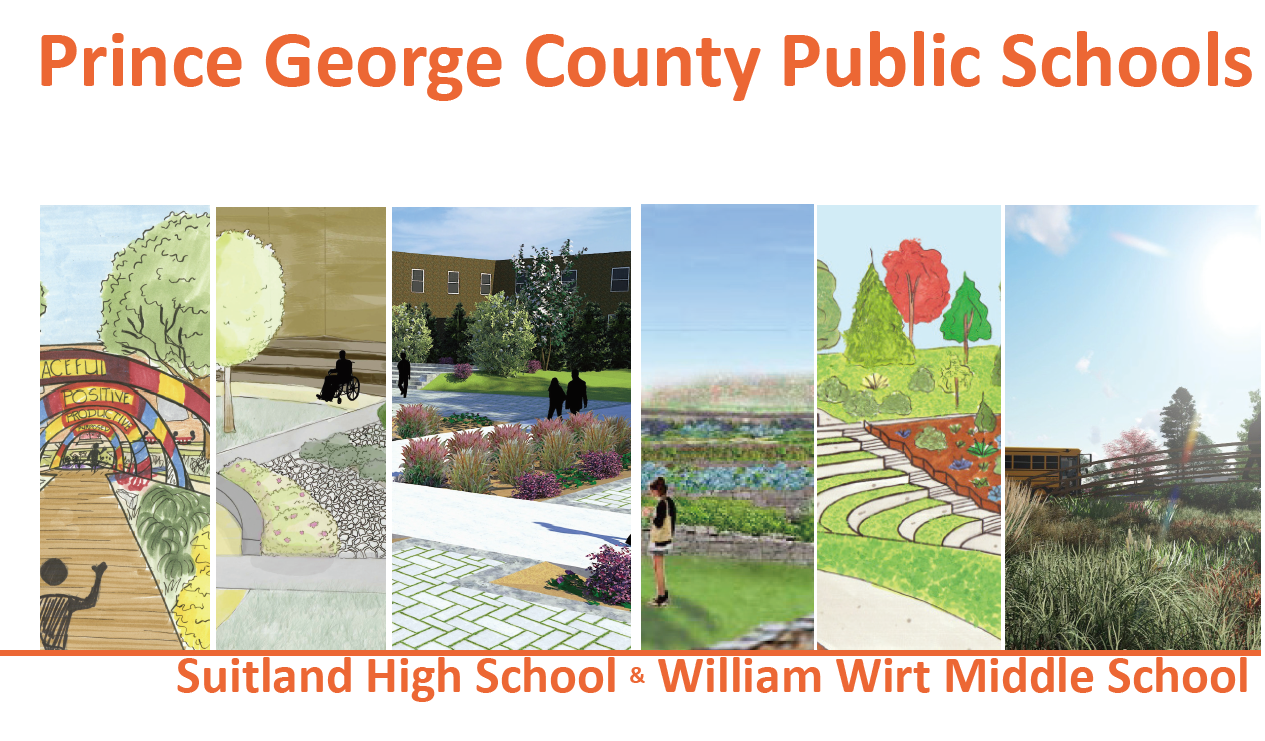 Landscape architecture designs for bringing nature onto the grounds of Prince George’s County’s Suitland High School and William Hirt Middle School.